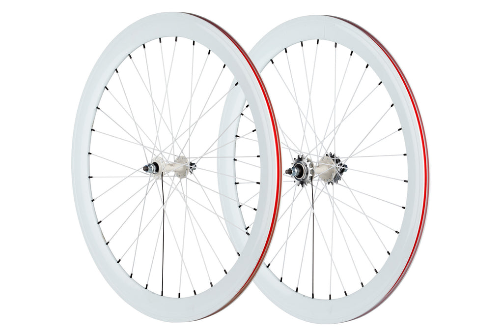 Pure Fix double-walled aluminum wheelsets are size 700C with a 50mm rim depth, front and rear. Our wheels include name-brand and laser-etched KT Quando hubs (100mm front, 120mm rear, 3/8" axle). Our rear wheels include flip-flop hubs with a pre-attached 16T fixed cog along with a 16T freewheel cog for single-speed riding. Our front and rear wheels are 32 spokes each. All wheelsets include nylon rim-strips to protect against sharp edges and prevent tube puncture.