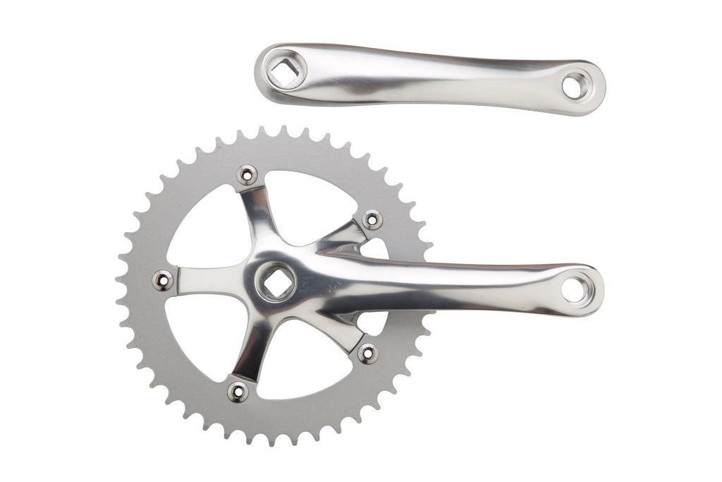 Our 3-piece fixed gear crank has 44 teeth and comes with a gear ring and right and left pedal arms.